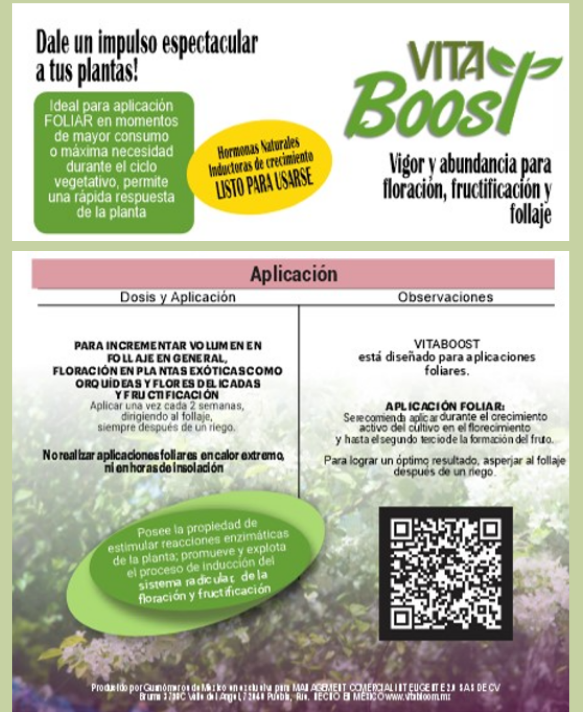 VITABOOST es un bioestimulante 100% orgánico fácil de usar listo para aplicar, que ofrece óptimos resultados para actuar a favor de tus plantas cuando lo aplicas en periodos de floración, fructificación, o simplemente para fortalecer y estimular el crecimiento de follaje, que por cierto, se pone espectacular!