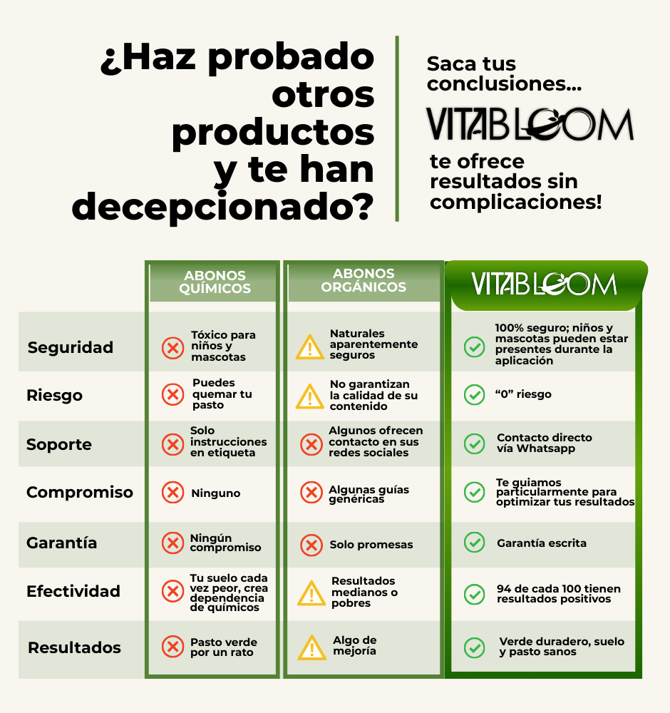 A diferencia de otros, aplicando NUTRICIÓN ORGANICA VITABLOOM no necesitas echarles nada mas, por eso podemos garantizarlo, porque funciona realmente y no daña tu familia ni ambiente.