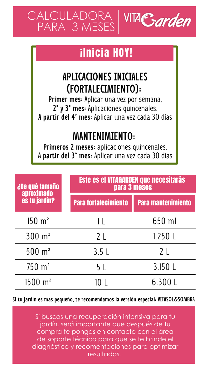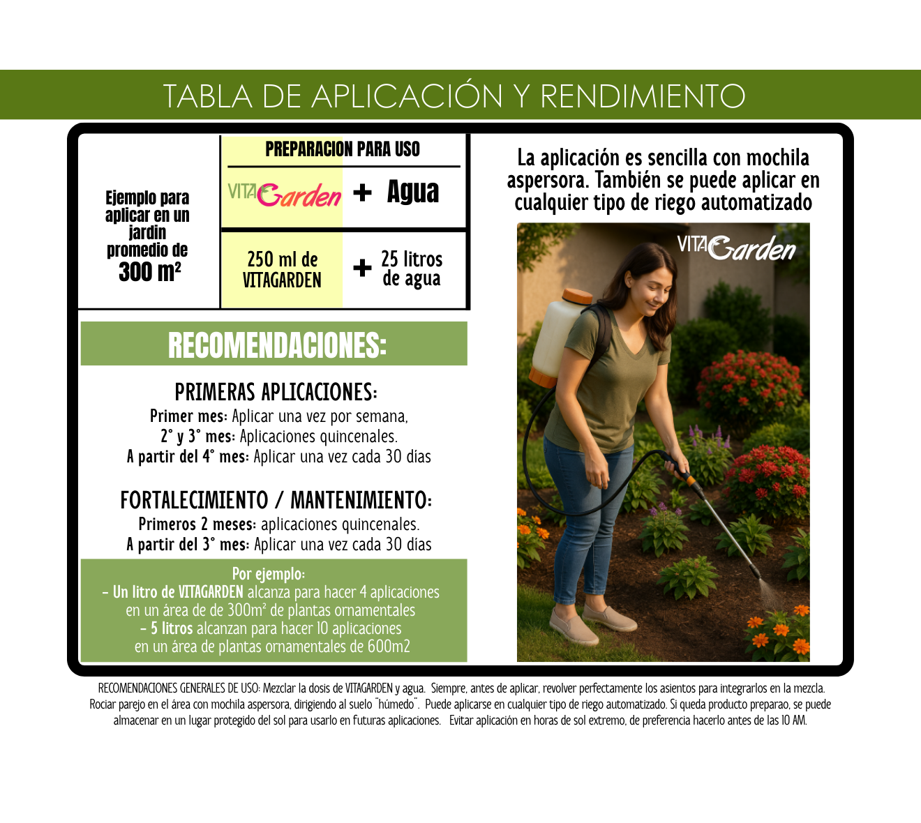 UN LITRO de VITAGARDEN rinde para cubrir hasta 1,200m2 de jardines. Se puede aplicar en cualquier sistema de riego (aspersión, drench, goteo, etc.)