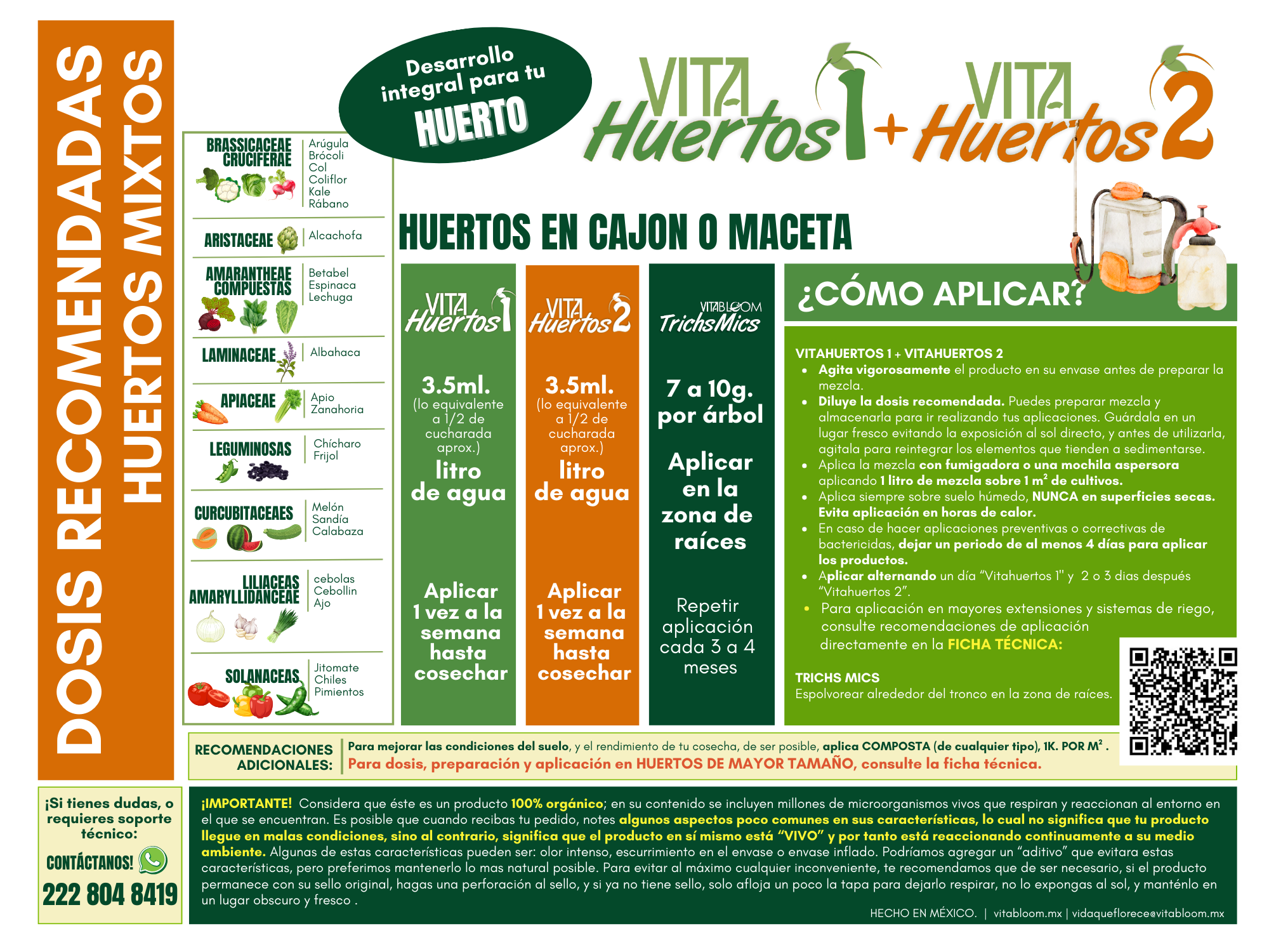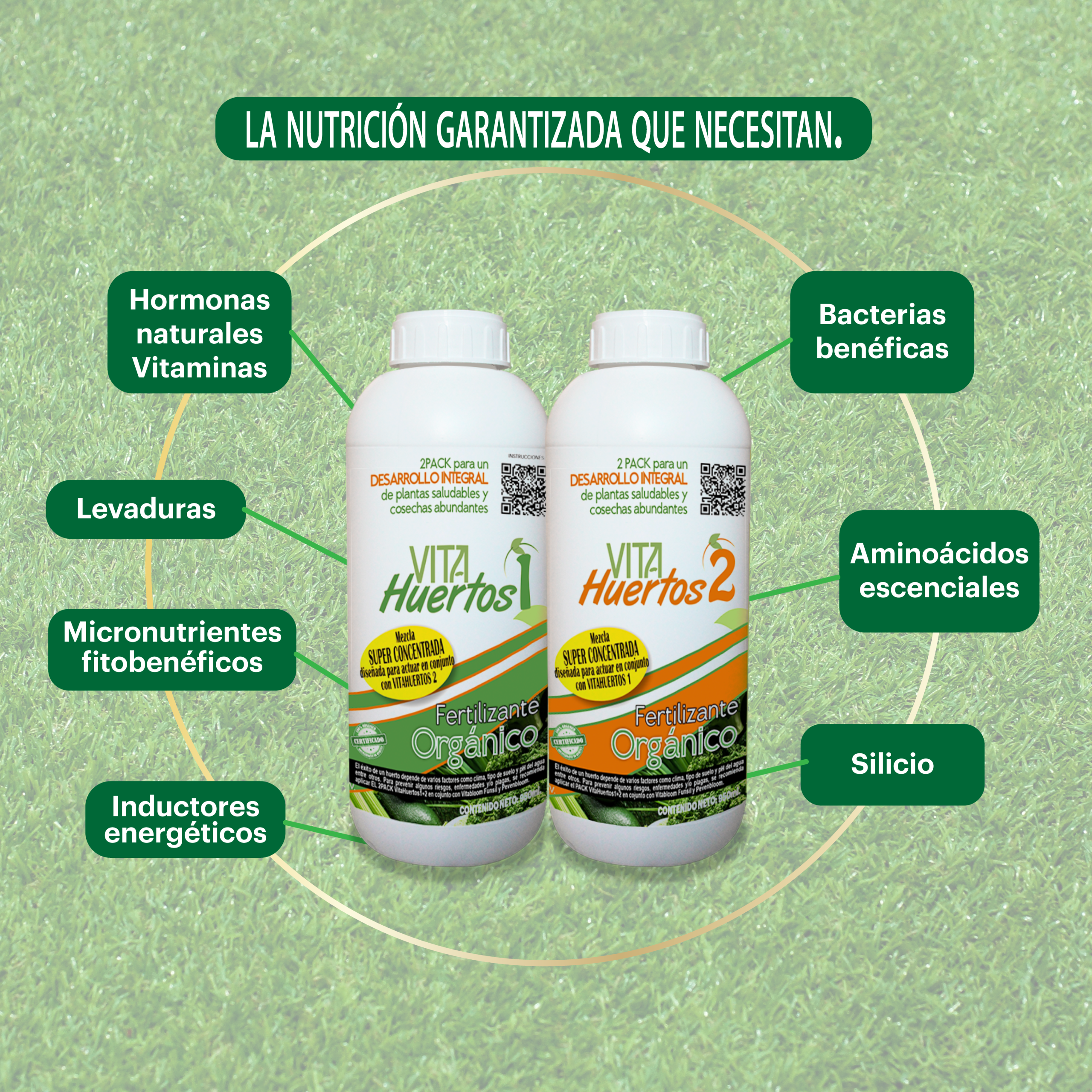 VITAHUERTOS DÚO es un biofertilizante especial para CULTIVOS MIXTOS de hortalizas, verduras, y frutales. Nutrición INTEGRAL 100% ORGÁNICA GARANTIZADA*. Recomendado para nutrir integralmente tus árboles frutales y cultivos variados en huerto sembrados en cajón, suelo o maceta. Nutrición GARANTIZADA para obtener cosechas saludables y abundantes.